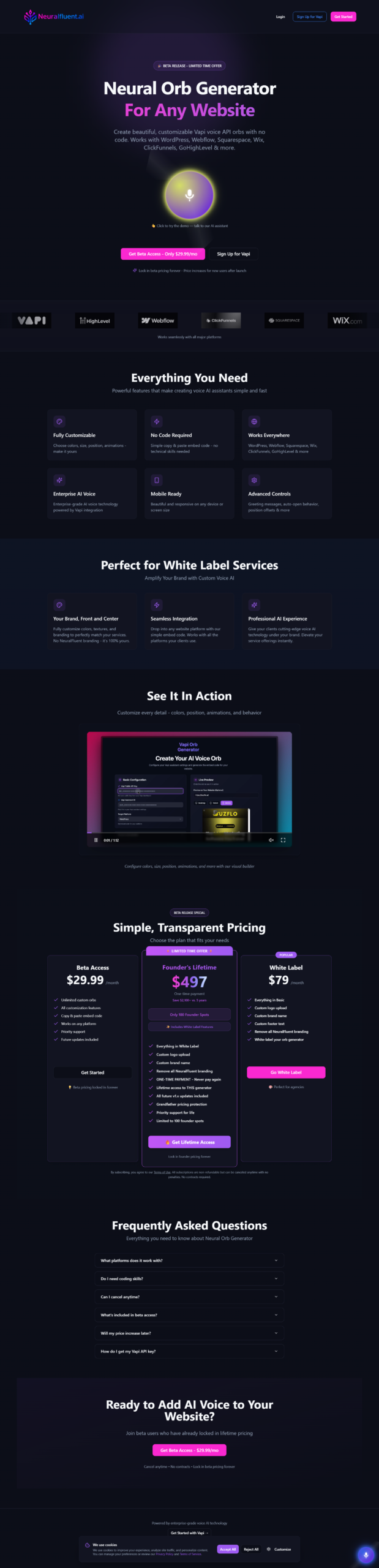 Create and customize Vapi voice orbs for any website with no coding required. Works seamlessly with platforms like WordPress, Webflow, Squarespace, Wix, ClickFunnels, and more.
